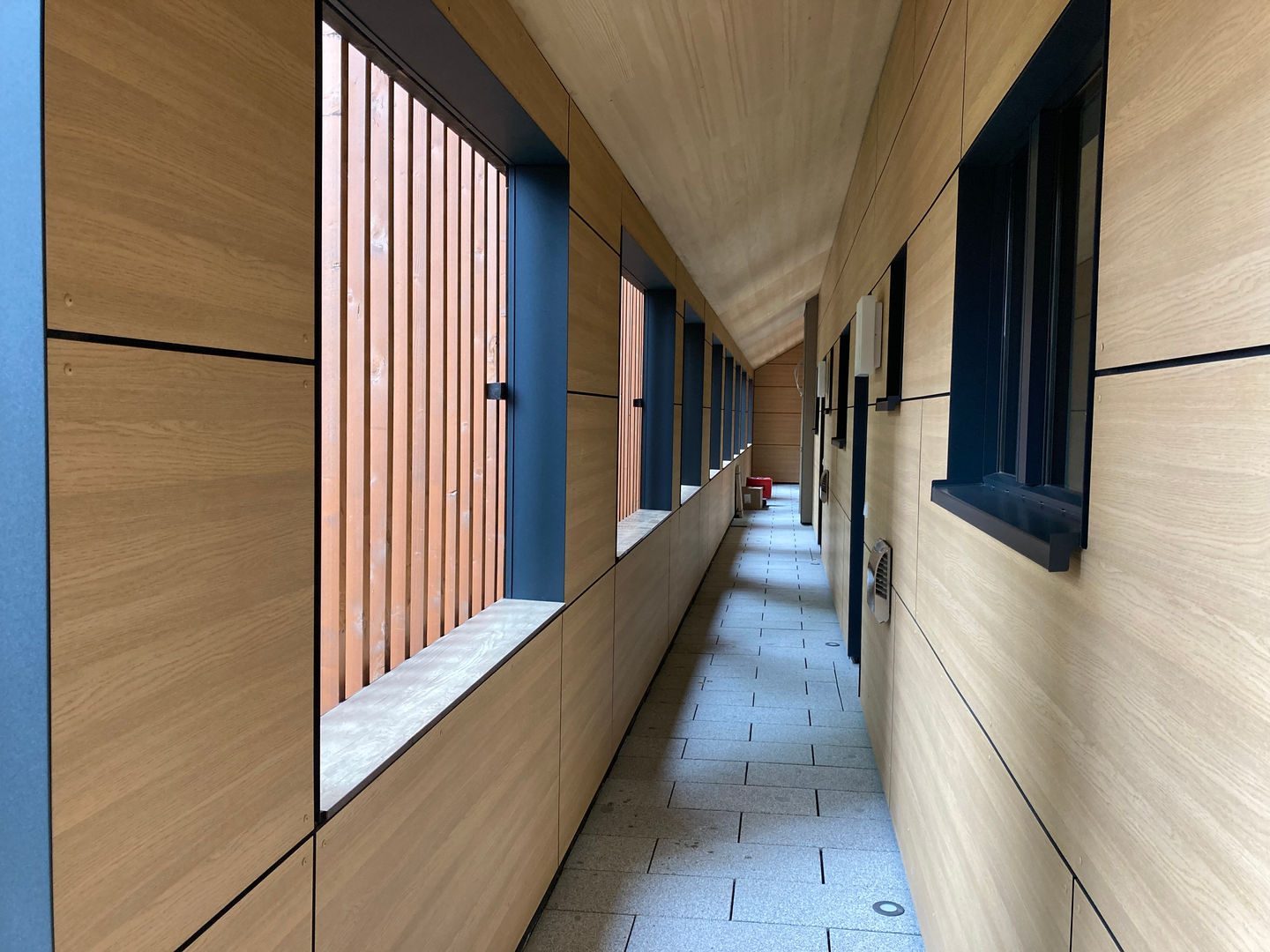 Neubau eines Laubenganghauses in Holzbauweise mit 9 Wohneinheiten. Die Außenwände sind in Holzrahmenbauweise, tragende Innenwände und Decken aus Brettsperrholz konstruiert. Die Tiefgarage ist als Stahlbetonbau mit Doppelwänden (Halbfertigteilen) errichtet.
