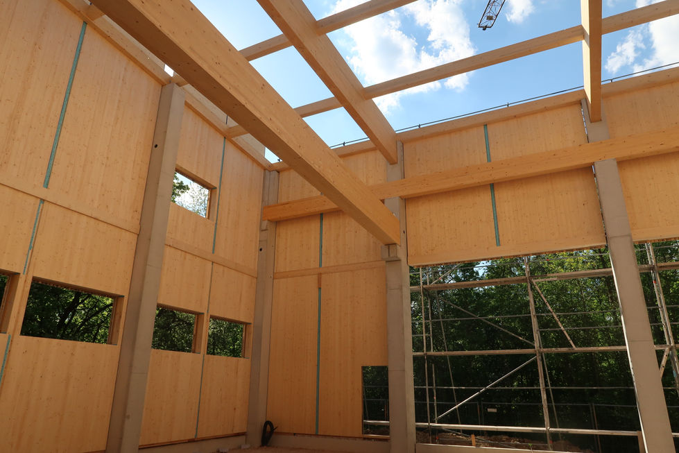 Eine bestehende Produktions– und Lagerhalle wurde um eine weitere Halle erweitert. Holzbinder aus Brettschichtholz spannen über 16,5m als Einfeldträger im Abstand von 6m. Zwischen den Bindern sind Pfetten aus Brettschichtholz im Abstand von 2,75m angeordnet. Die Binder lagern auf eingespannten Stahlbetonstützen. In Hallenlängsrichtung verläuft ein 5t Brückenkran. Die Krandbahnträger bestehen ebenfalls aus Brettschichtholz und verlaufen in Hallenlängsrichtung. Diese lagern auf Konsolen der eingespannten Stahlbetonstütze. Die besondere Herausforderung lag in der Kreuzung der neuen Kranbahn mit der Verlängerung der Kranbahn aus der bestehenden, quer dazu verlaufenden Halle. Im Übergangsbereich zur neuen Halle musste die Dachkonstruktion stützenfrei abgefangen werden. Die Gründung der Fertigteilstützen erfolgt über Einzelfundamente, welche bereits monolithisch verbunden mit der Stütze gefertigt wurden.